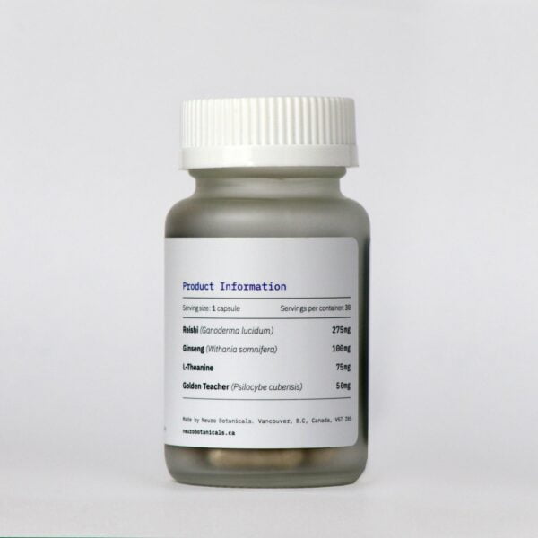 Ingredients: Golden Teacher (Psilocybe cubensis), Reishi (Ganoderma lucidum), Ginseng (Withania somnifera), and L-Theanine